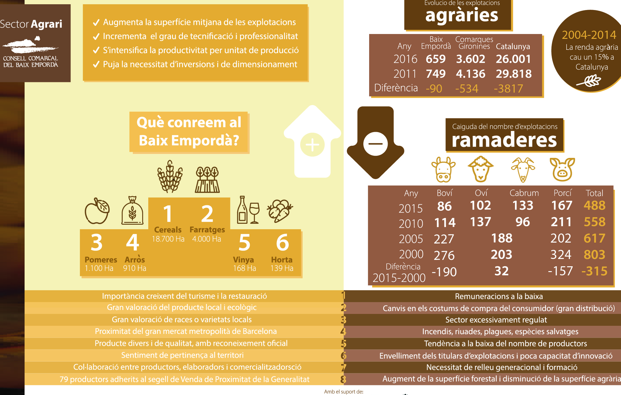El sector incrementa el grau de tecnificació i professionalitat però cau la renda agrària i el nombre d’explotacions agràries i ramaderes. 2 Diagnosi Agrari del Baix Empordà